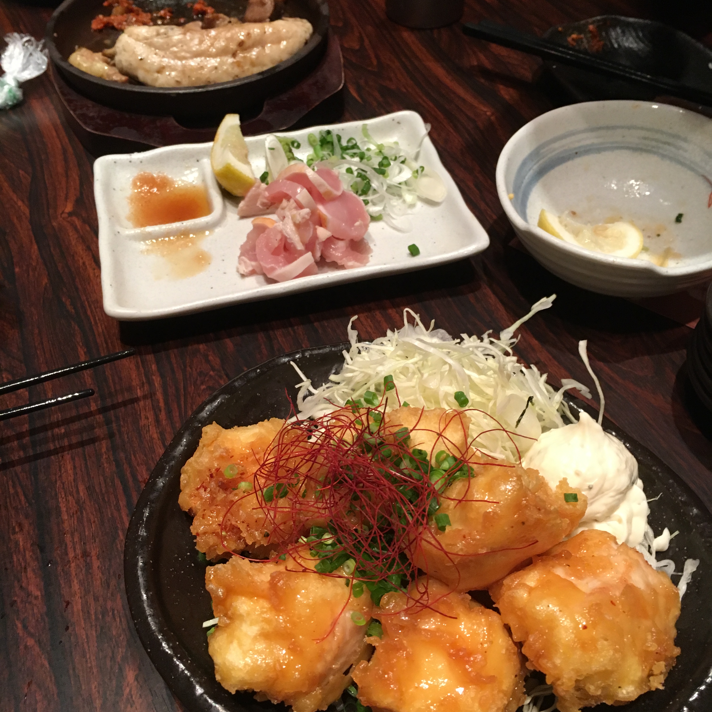 定番の唐揚げと鶏の刺身?