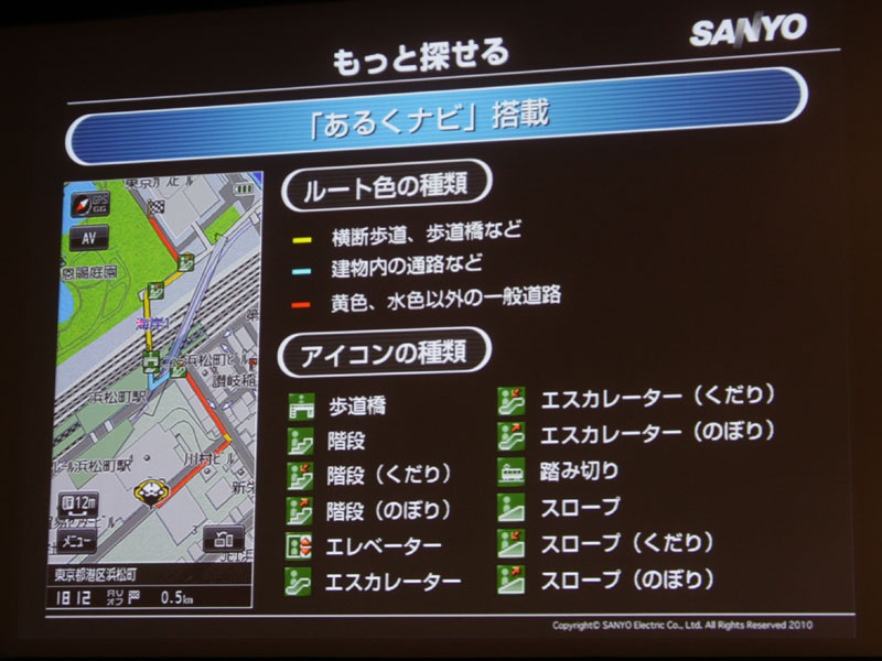 歩行者専用の地図データを収録し、地下街や駅の連結路、歩道橋、地下通路、公園などを歩行用ルートとして表示できるようになった。階段や歩道橋などの専用アイコンも採用している。また、本体を縦に持つことで歩行向けの縦画面表示に切り替わる自動切り替え機能も採用。従来のボタン押しによる切り替えも行なえる。