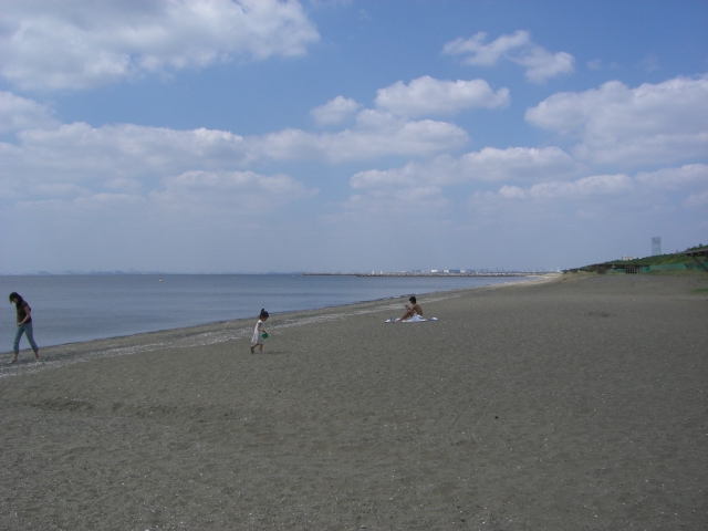 母と子が遊び 横には若者が日焼けを楽しんでいます♪