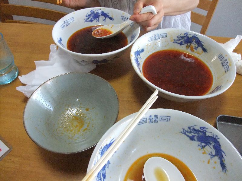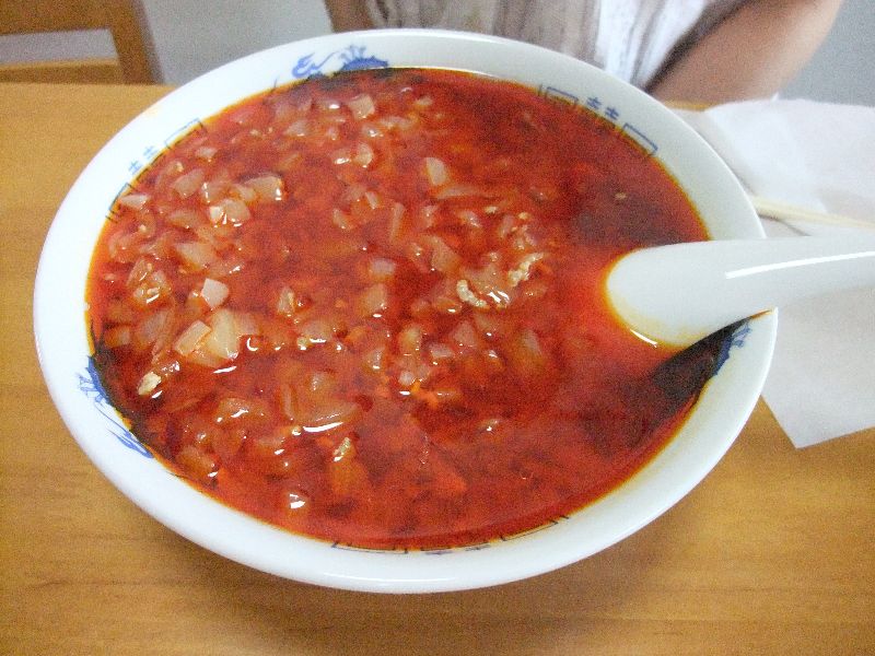 この赤いスープをご覧下さい(ラー油ですね)